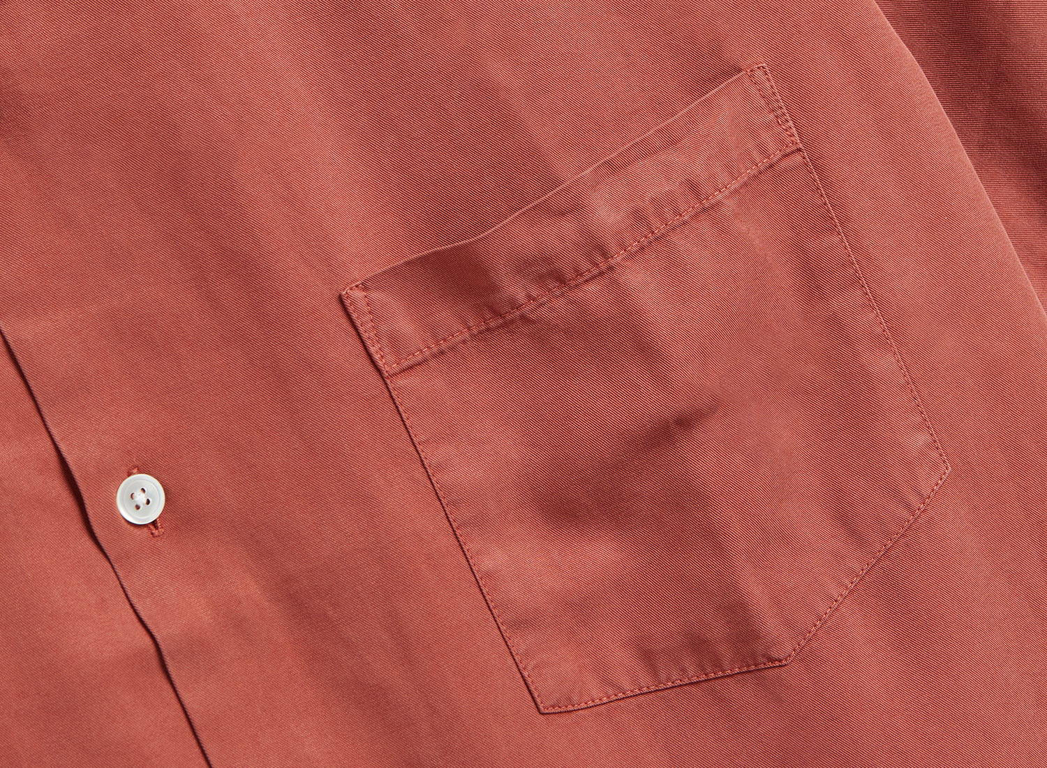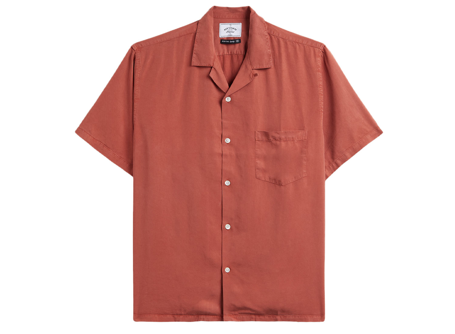 PORTUGUESE FLANNEL Dogtown Shirt Terracota. Chemise à manches courtes et coupe droite, confectionnée dans un tissu léger 100% Tencel. Son col cubain et ses boutons en nacre lui apportent une touche raffinée et estivale. • Coupe droite • Col cubain • Manches courtes • Tissu 100% Tencel • Boutons en nacre