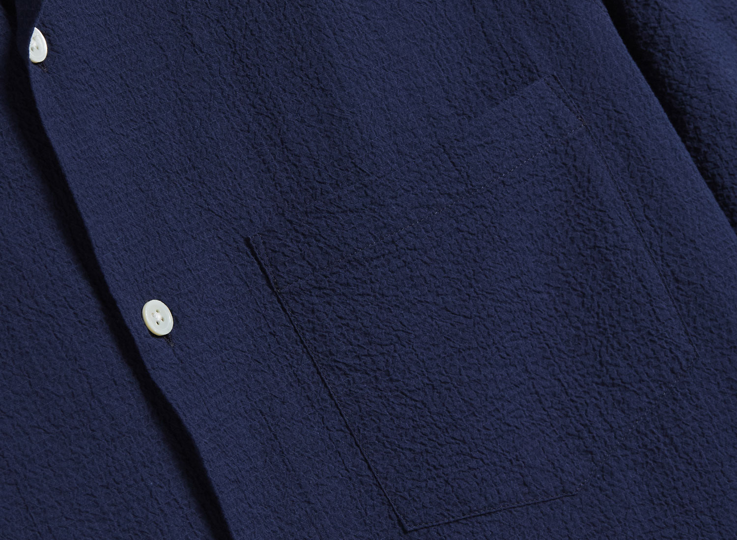 PORTUGUESE FLANNEL Flame Shirt Navy. Chemisette coupe droite confectionnée dans un tissu gauffré seersucker léger et très confortable. 98% coton / 2% Elasthanne. Poche poitrine. Col ouvert. Bas droit.