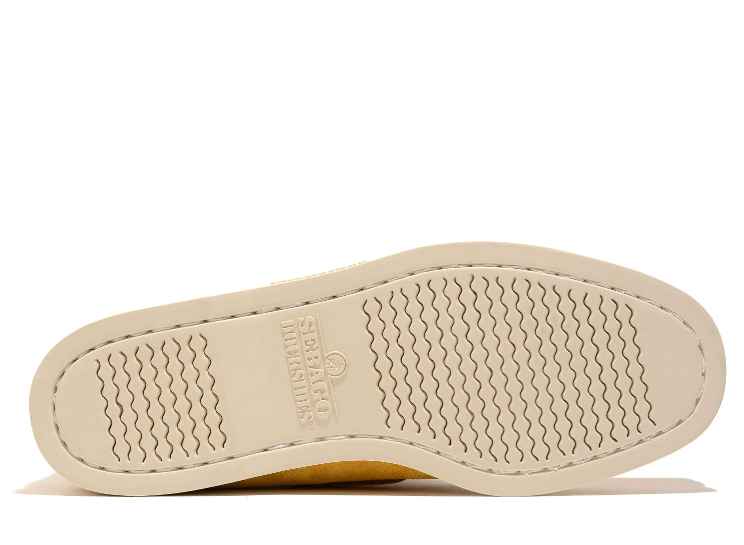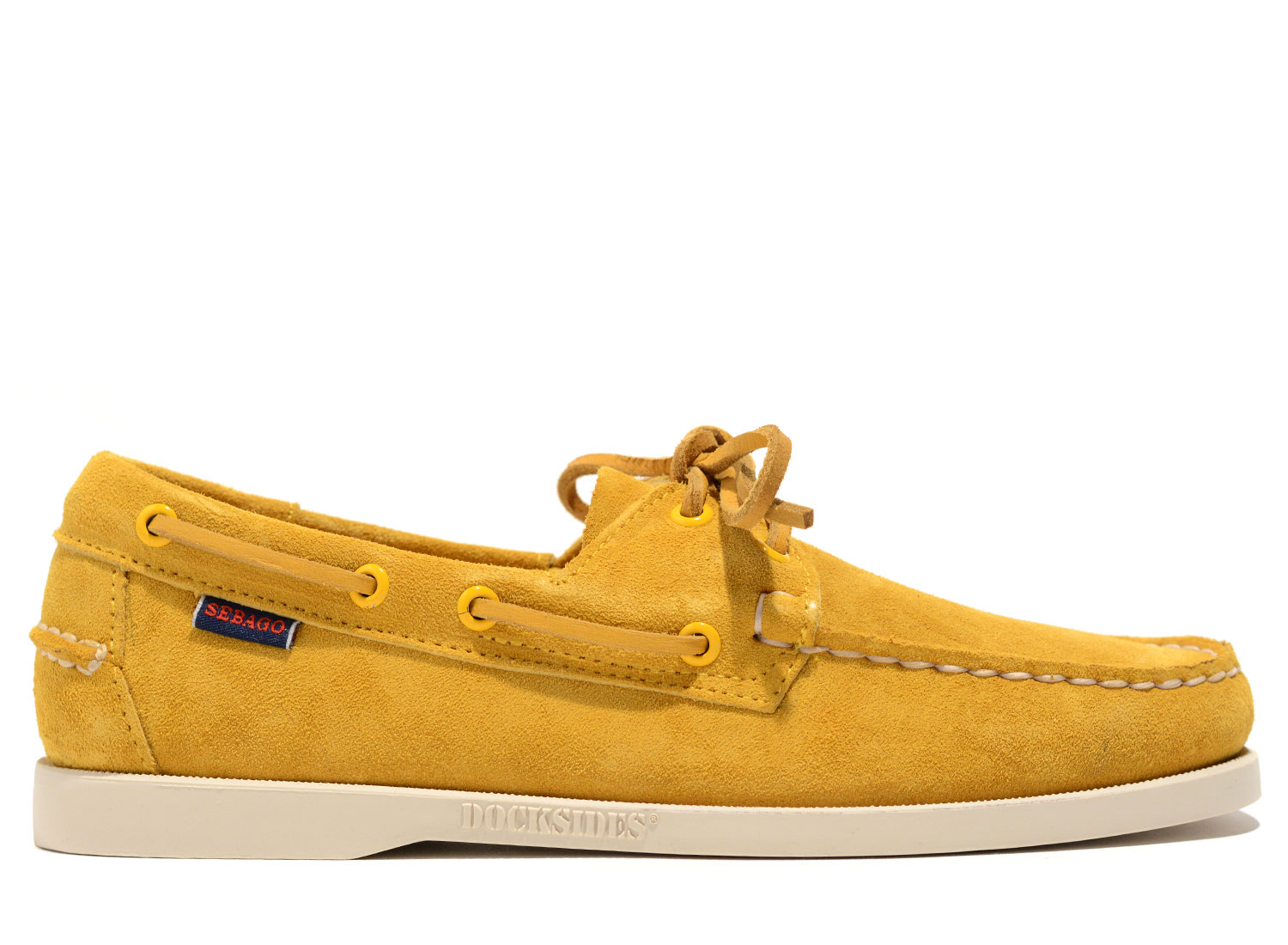 SEBAGO Docksides Portland Flesh Out Yellow. Les authentiques chaussures bateaux Sebago. Cousues main. Empeigne en daim non doublée. Semelle intérieure en cuir. Lacet en cuir brut tout autour du pied. Semelle extérieure en caoutchouc anti-dérapant.