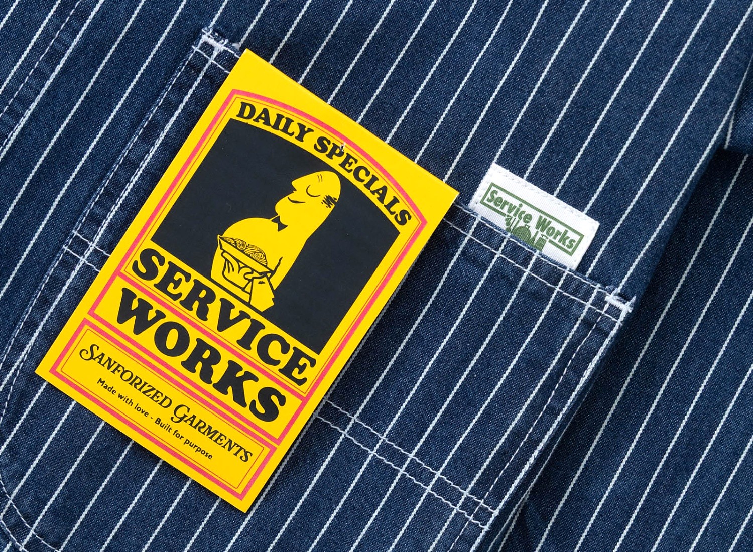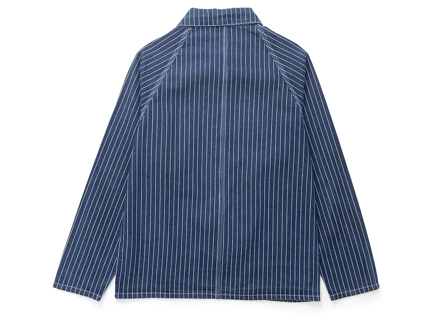 Rayures pinstripe verticales tissées dans le denim pour un héritage visuel du vêtement de travail américain.