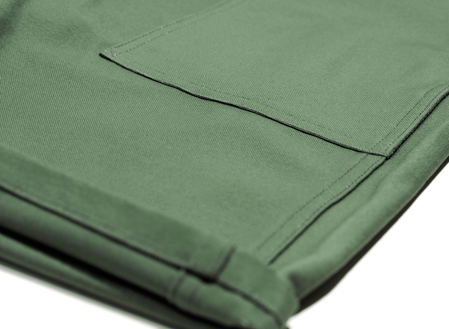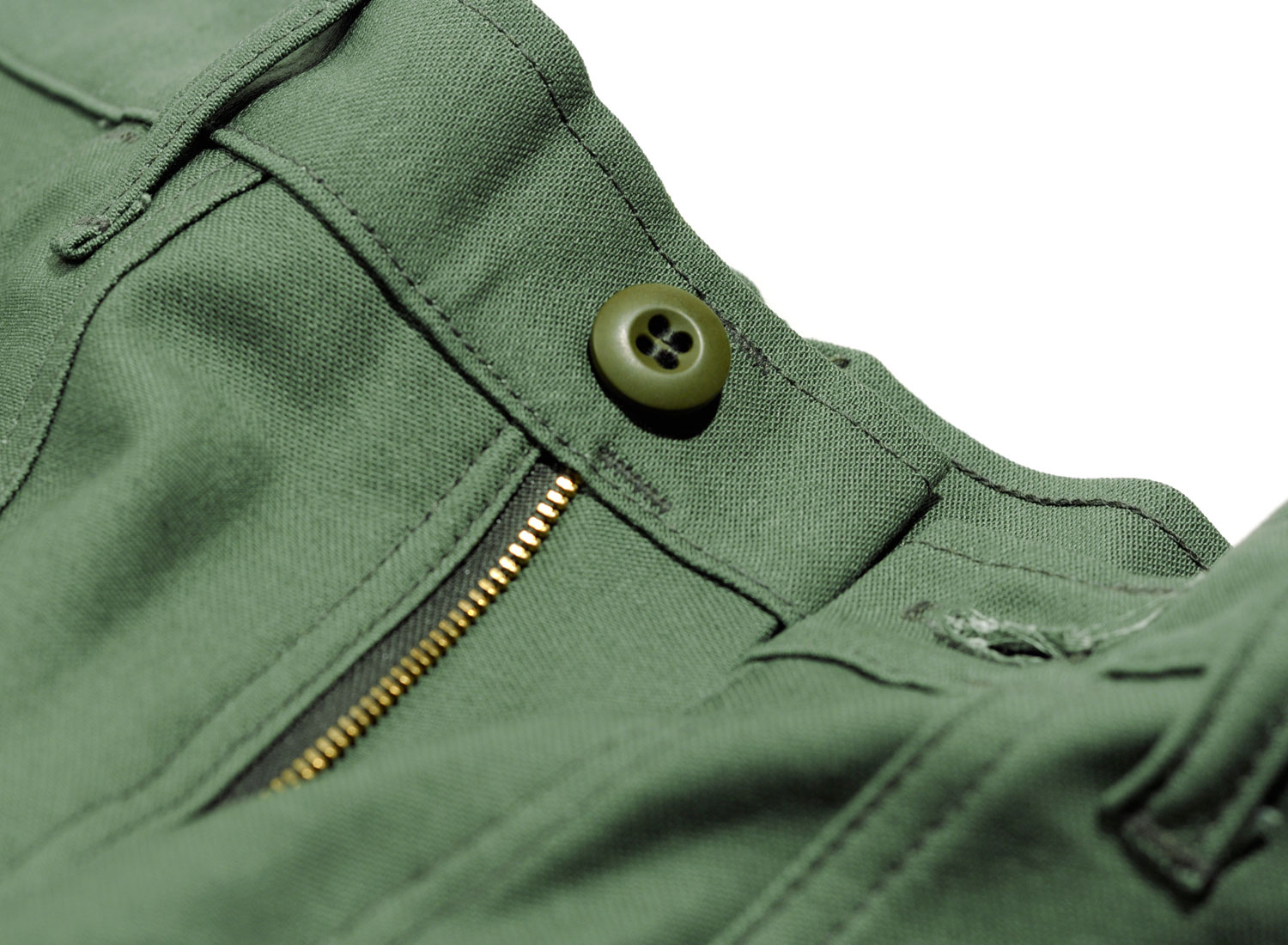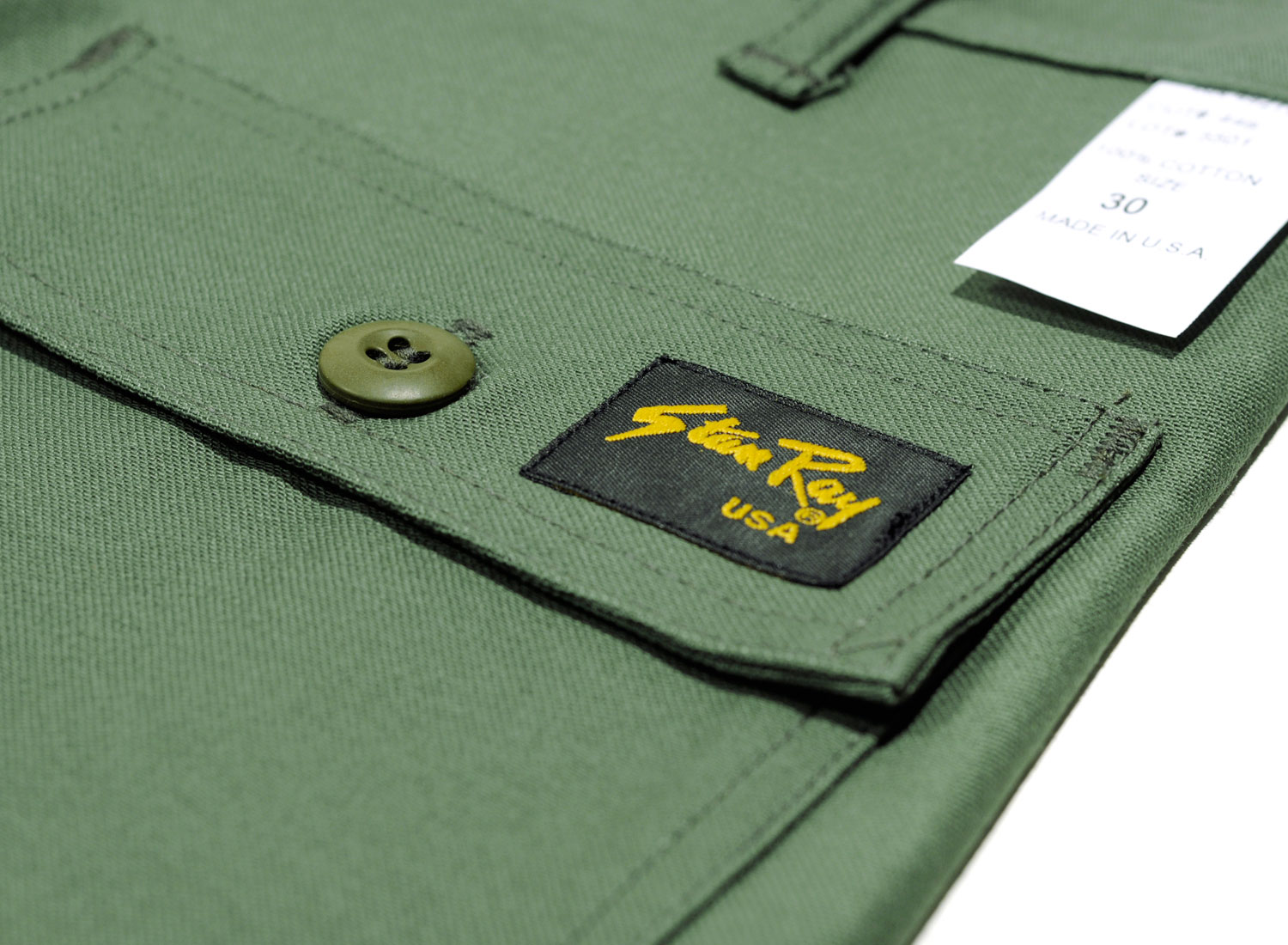 STAN RAY Fatigue Short Olive Sateen. Short fatigue confectionné en twill de coton. Coupe regular. Longueur genoux. Deux grandes poches sur l'avant. Deux poches à rabats boutonnés sur l'arrière. Braguette zippée. Fabriqué aux USA.