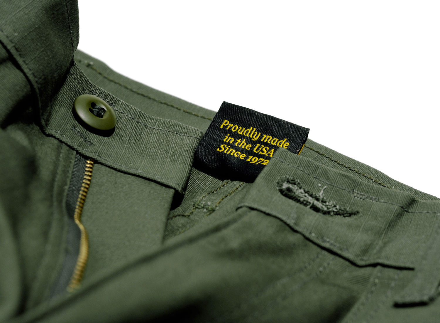 STAN RAY Slim Fit 4 Pocket Fatigue Pants Olive Ripstop. Pantalon fatigue confectionné en coton ripstop. Coupe carotte resserrée sur le bas. Deux poches à rabats boutonnés sur l'arrière. Deux poches côtés. Braguette zippée. Fabriqué avec fierté aux USA !
