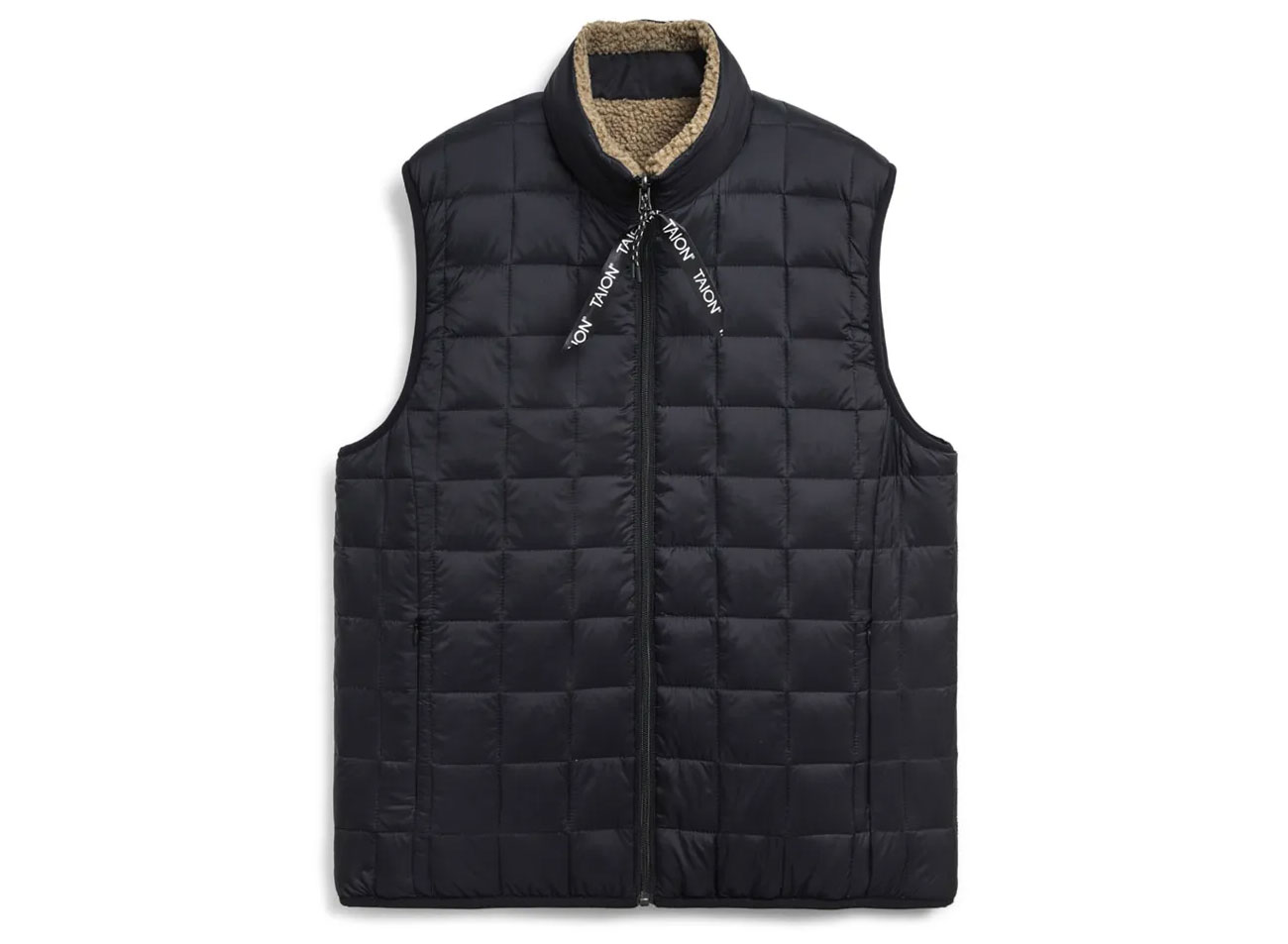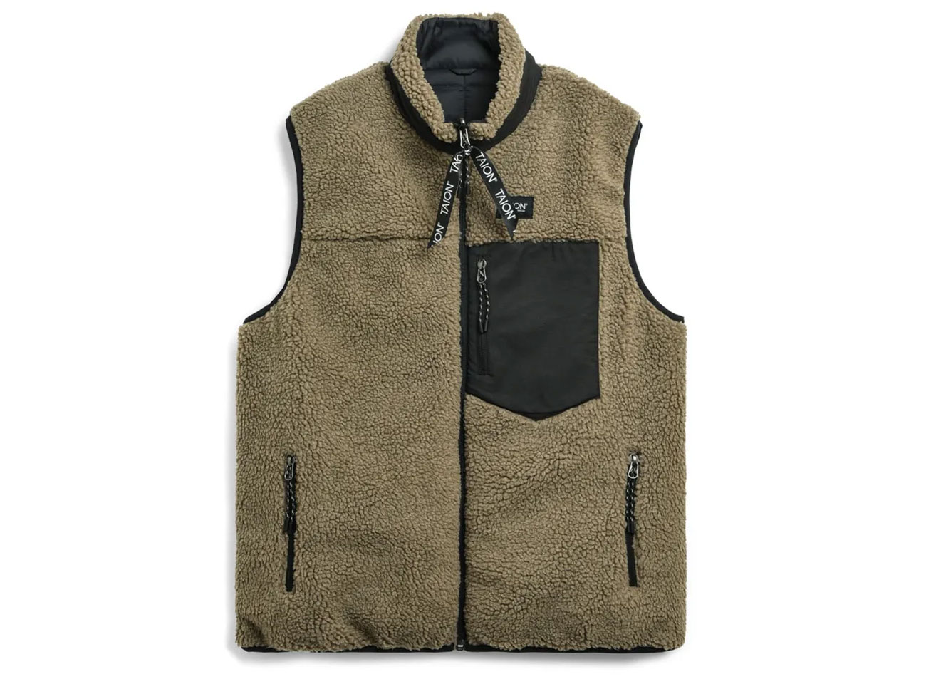TAION Down x Boa Reversible Down Vest Black / Beige. Veste sans manche zippée reversible coupe regular. Une face matelassée 100% nylon et une face en polaire sherpa 100% polyester. Isolation en duvet d'oie. Poches zippées sur les côtés et une poches contrastée sur la poitrine côté sherpa.