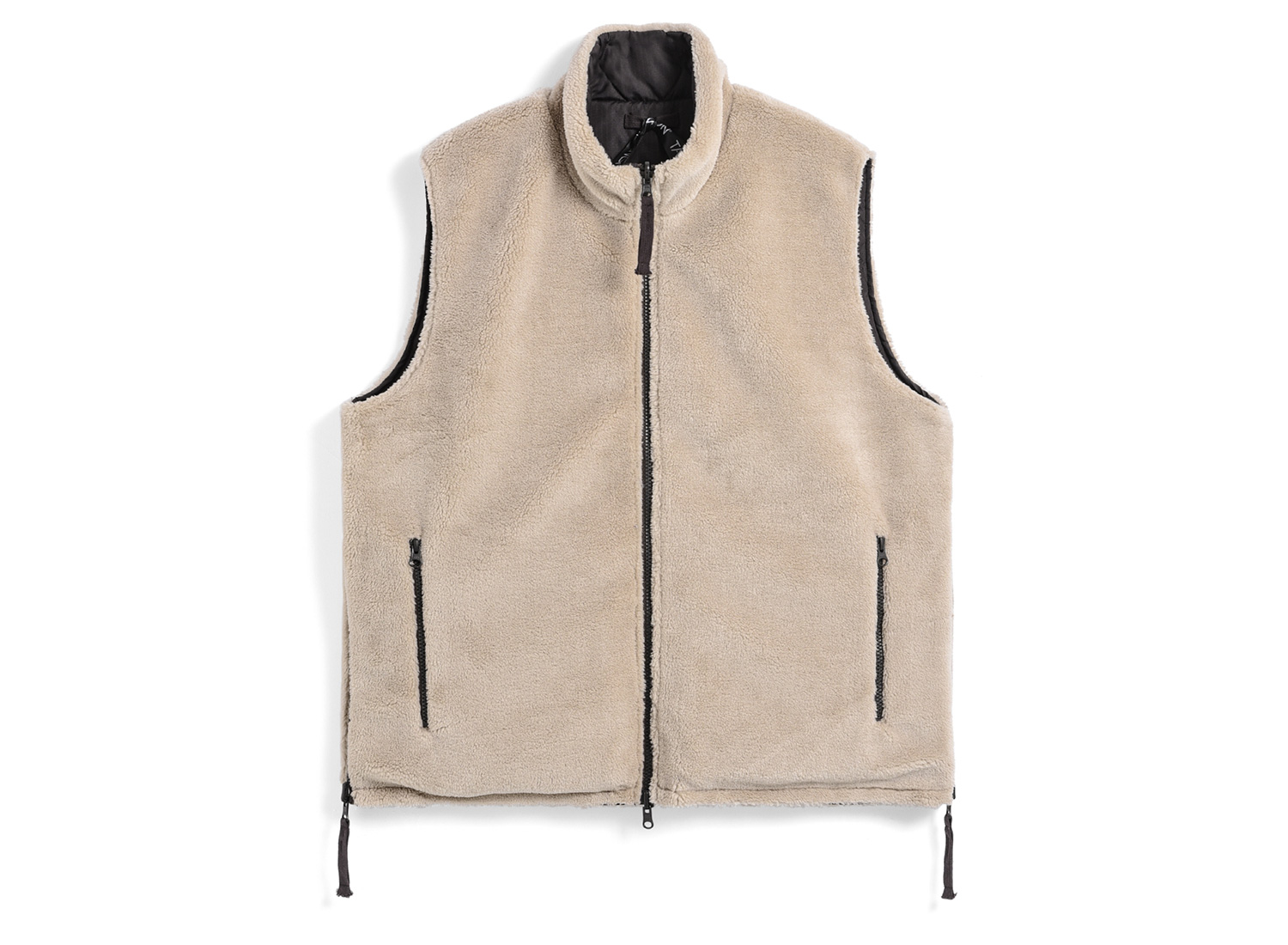 TAION R002BML-1 Military Reversible Hi Neck Down Vest Dark Choco / Beige. Veste sans manches réversible, avec un côté duvet et un intérieur en polaire sherpa très douce. Face externe en ripstop polyester 5 mm, tissu durable. Garnissage 95 % duvet / 5 % plumes de canard, avec duvet de haute qualité (800 FP). Fermeture zippée frontale, col montant (“hi-neck”) pour protection contre le vent. Fentes latérales zippées, poches chauffe-main des deux côtés ; poches plaquées côté sherp