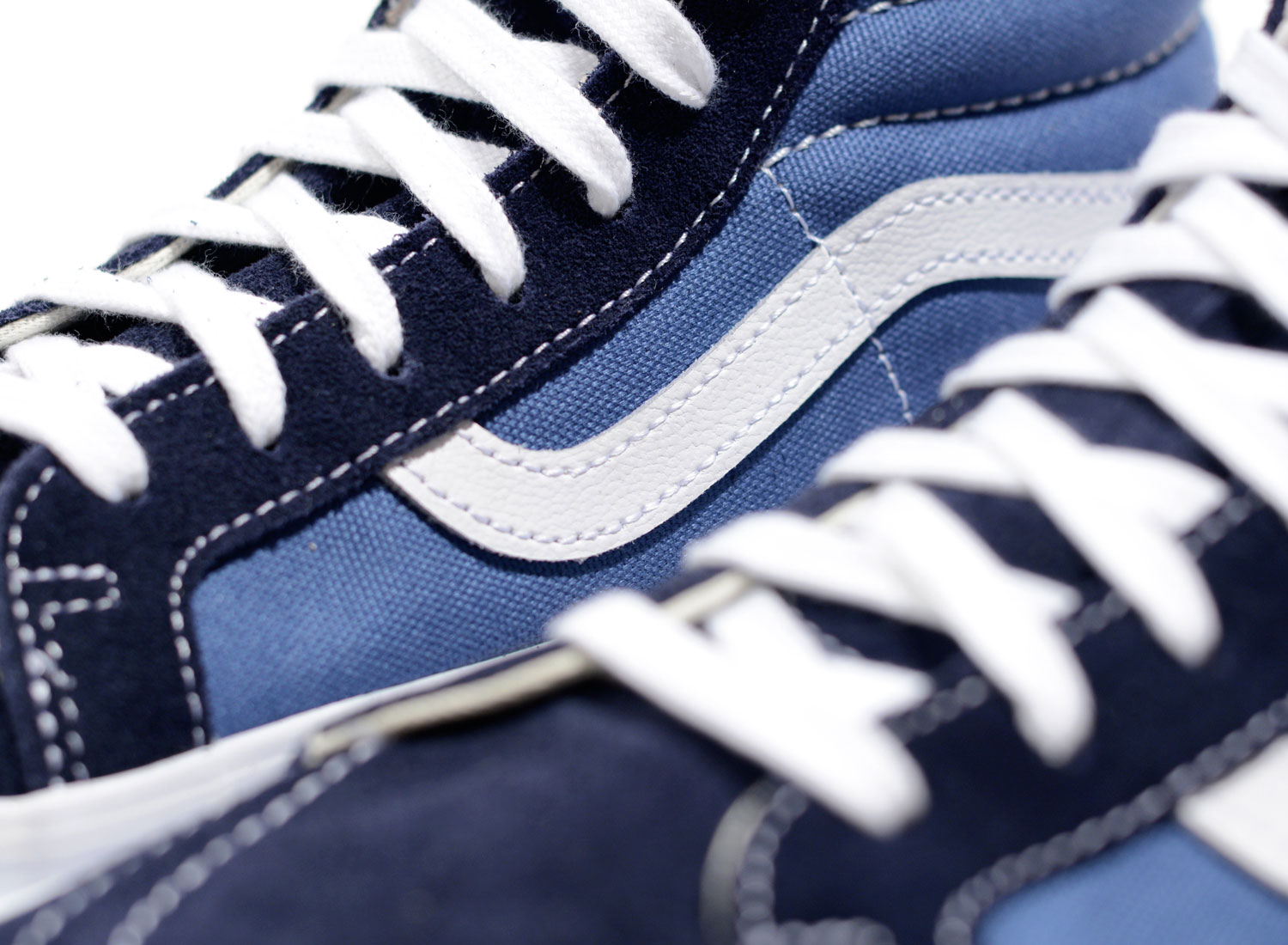 VANS VAULT OG Sk8-Hi LX Navy. Magnifique réédition de la SK8 HI OG. Mélange de canevas et suede. Shape original.