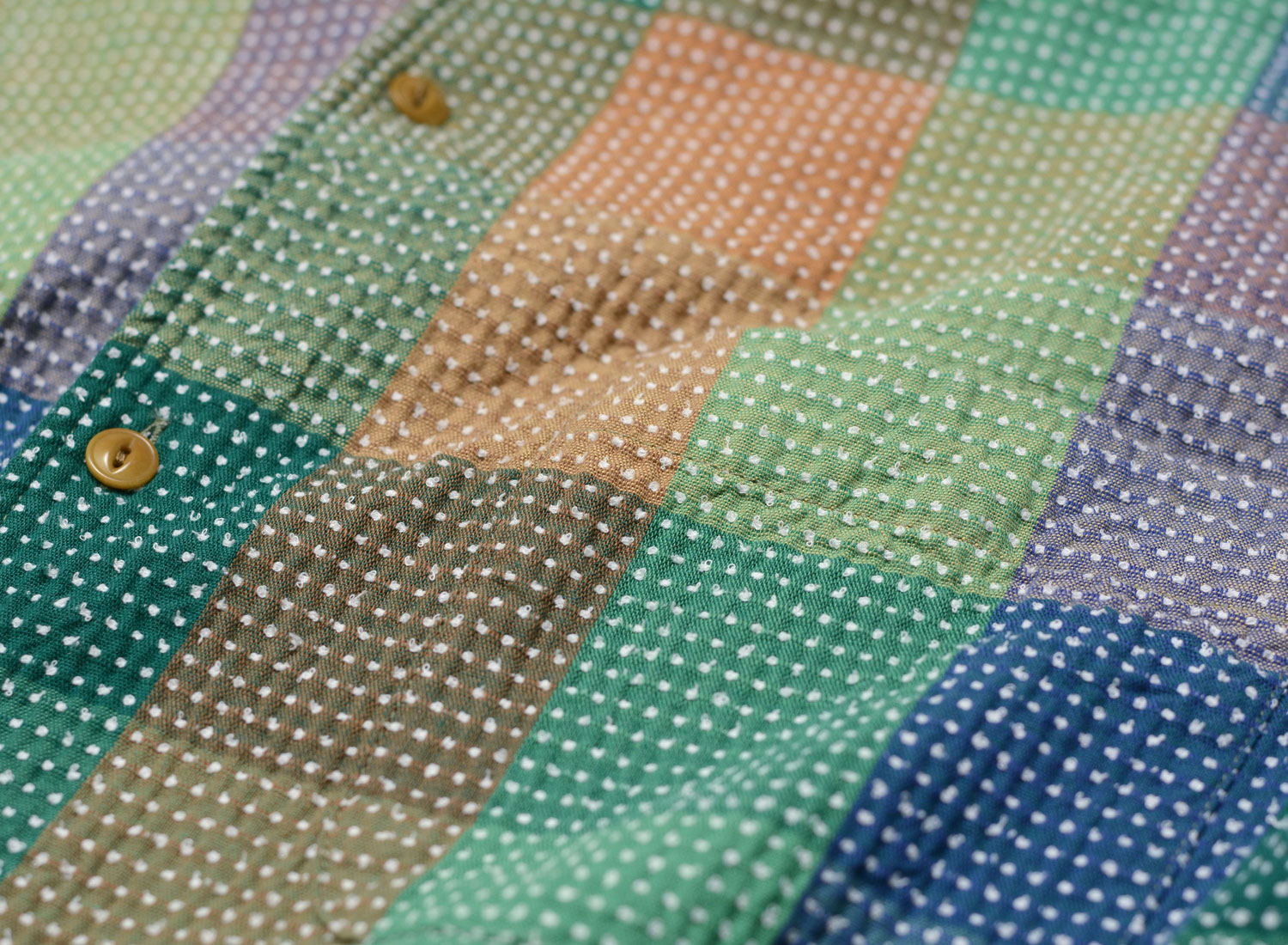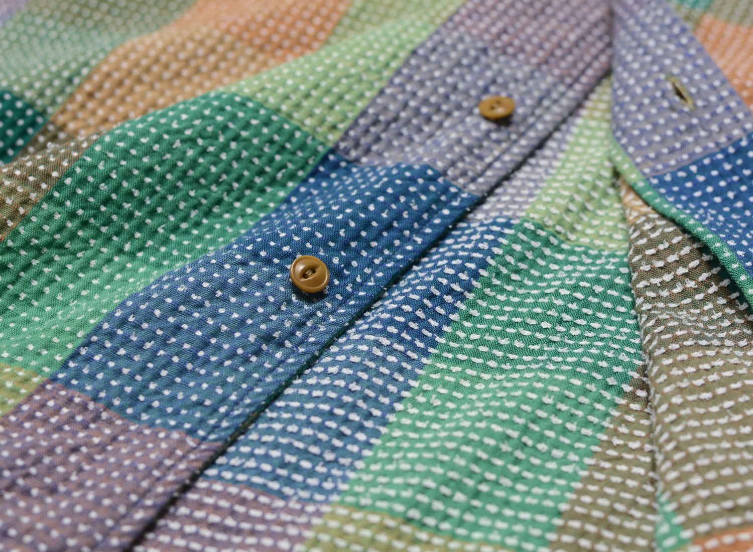 YMC P2WAJ Malick Shirt Multi. Chemisette coupe droite confectionnée dans un tissu jacquard micro dots. 90% coton / 10% Polyamide. Poche poitrine. Bouton en corozo. Bas droit.