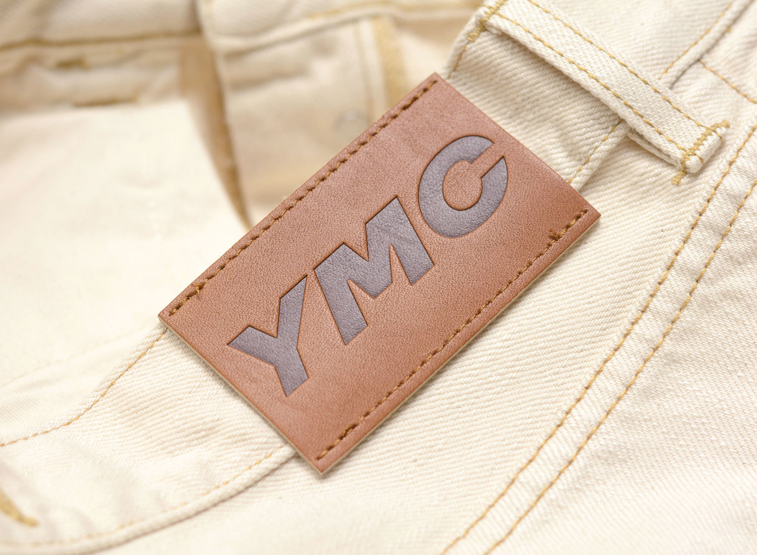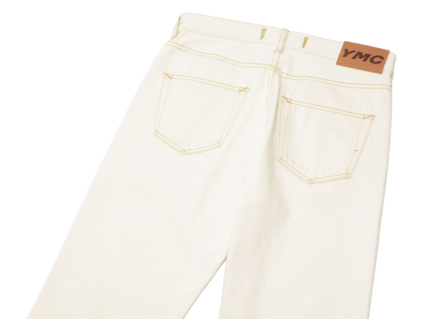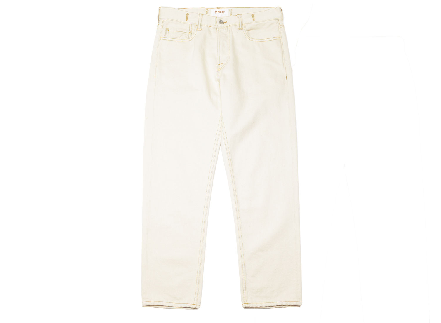 YMC P4AZB Tearaway Jean Ecru. Pantalon 5 poches confectionné en denim ecru 100% coton. Coupe droite longueur cheville. Poches côtés et poches arrières. Braguette zippée. Coutures contrastées. Patch YMC en cuir.