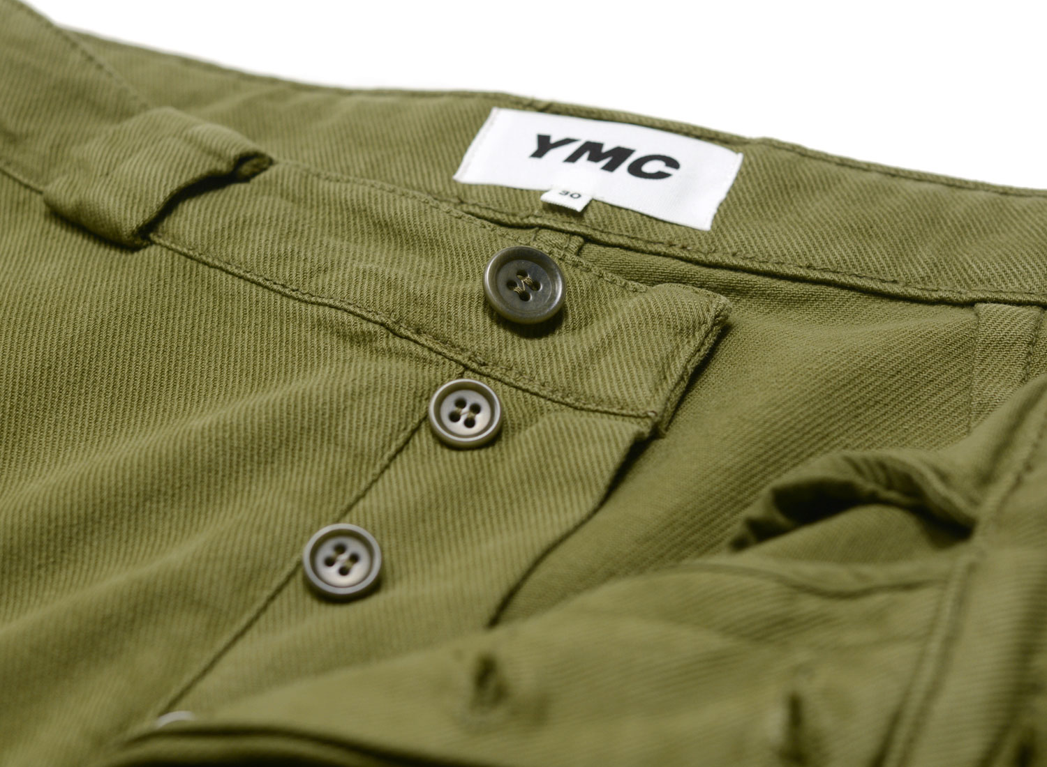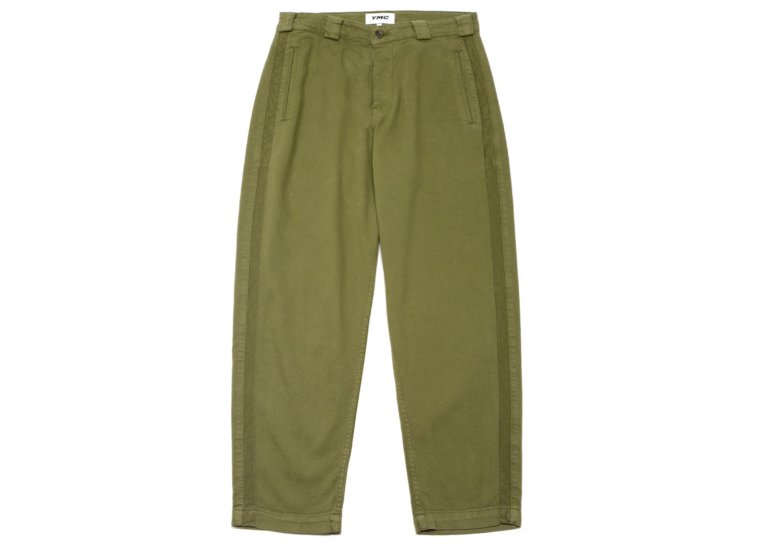 YMC P4WAK Babe Ruth Baseball Trouver Olive. Pantalon coupe ballon confectionné dans canevas lavé. 97% coton / 3% Élasthanne. Braguette boutonnée. Bandes chevron le long des jambes. Poches passepoilées sur les côtés. Une poche plaquée au dos.