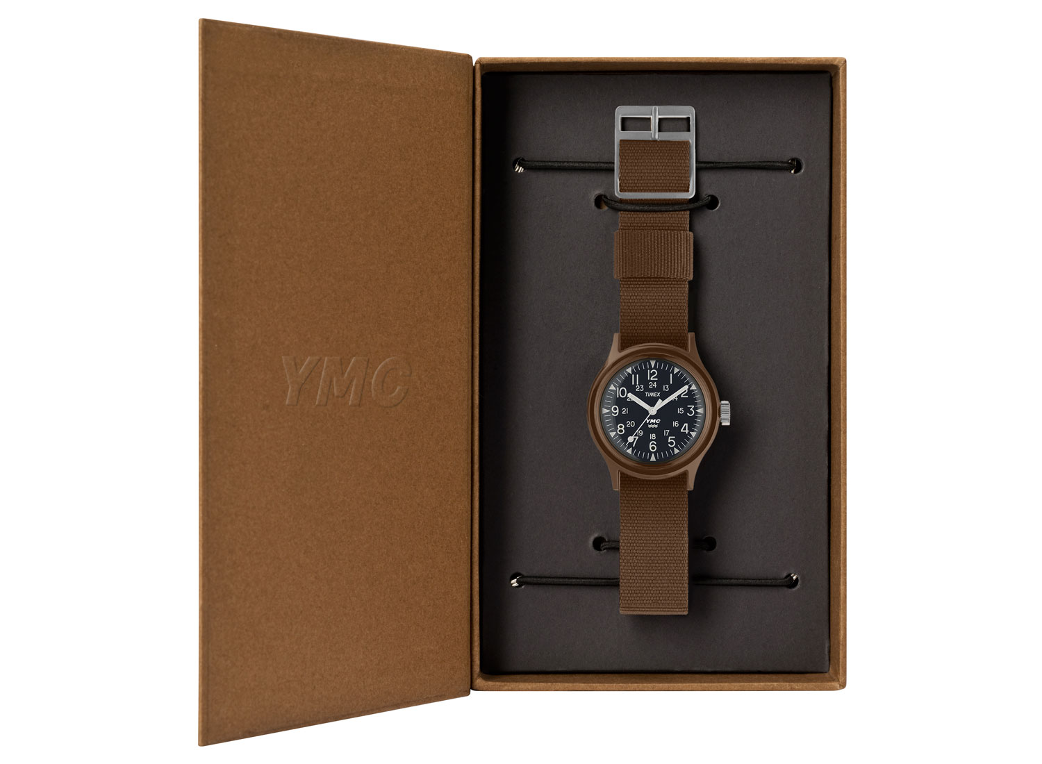 YMC x TIMEX MK1 Resin Brown. Très belle collaboration en édition limitée entre TIMEX et YMC. Modèle : Limited Edition Camper MK1. Série produite pour l'US Navy en 1982. Bracelet en tissu. Fabriqué au Japon. Mouvement Quartz. Étanche à 30 mètres.