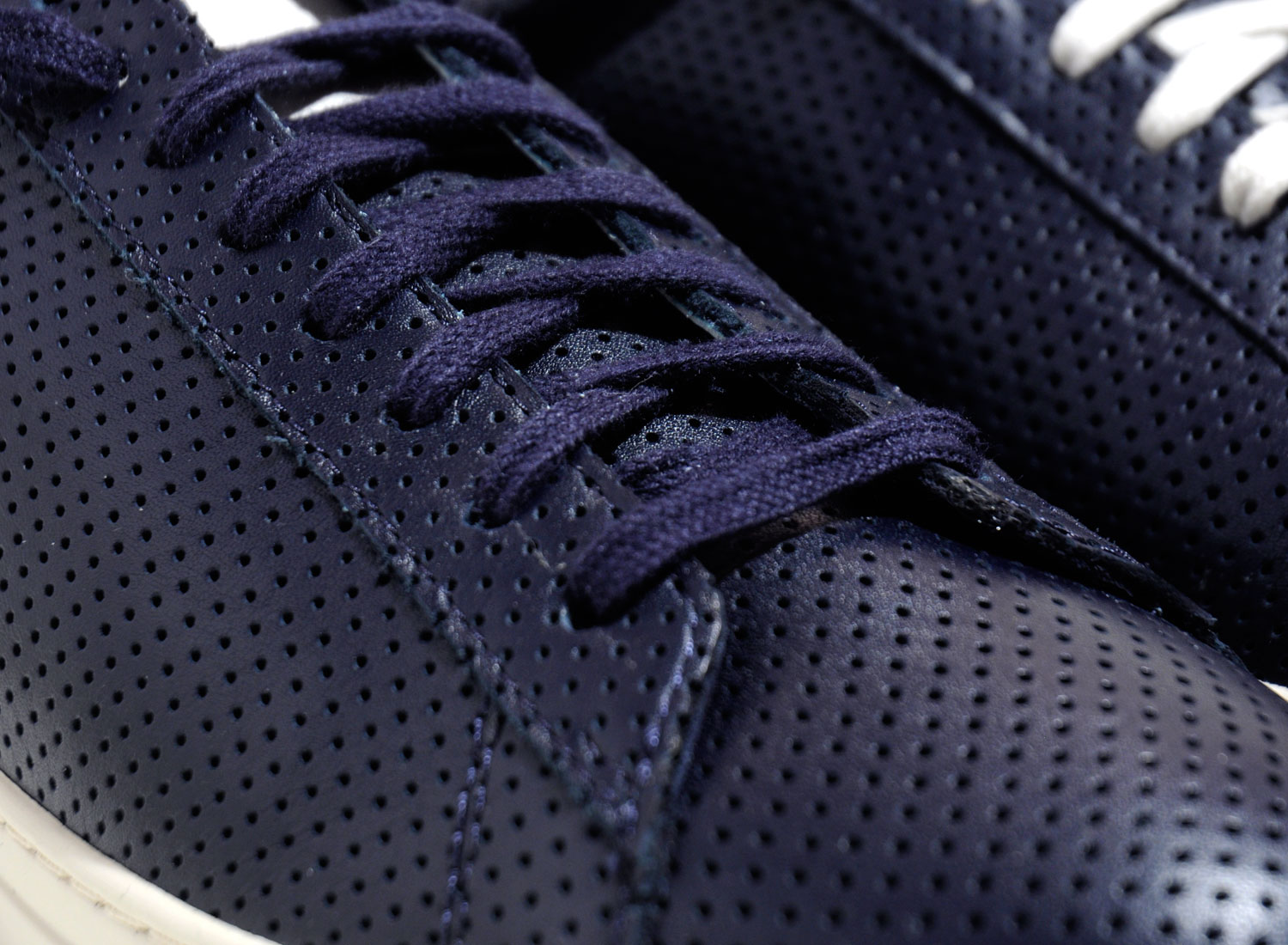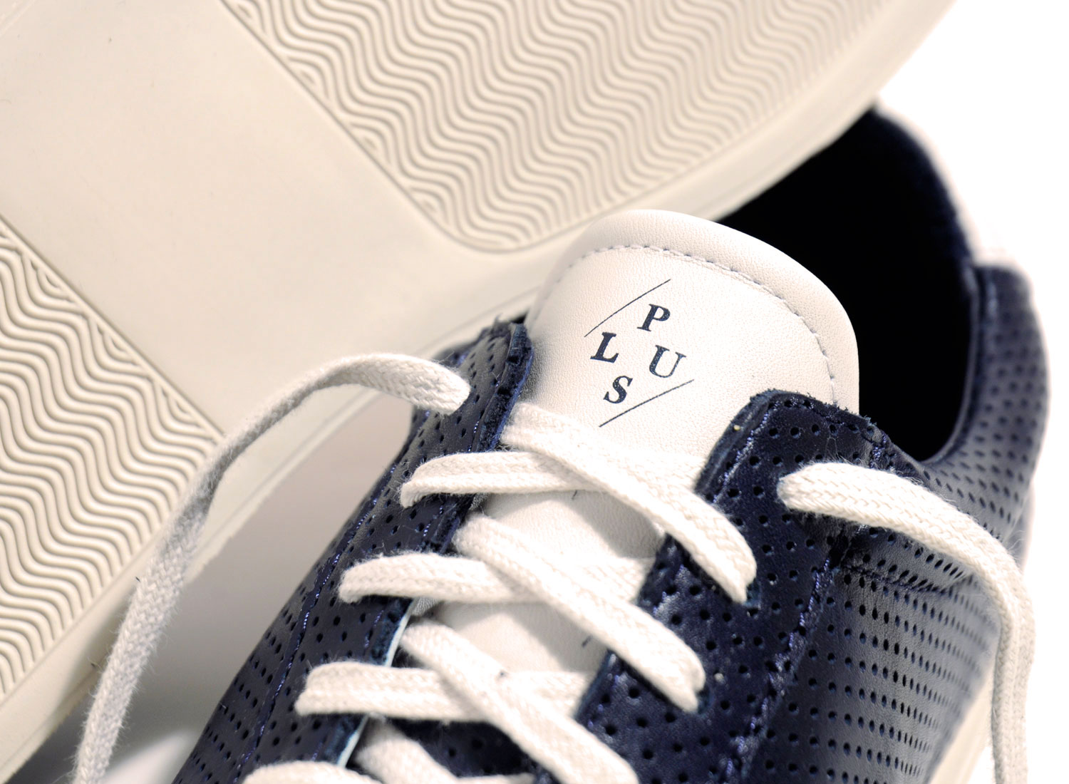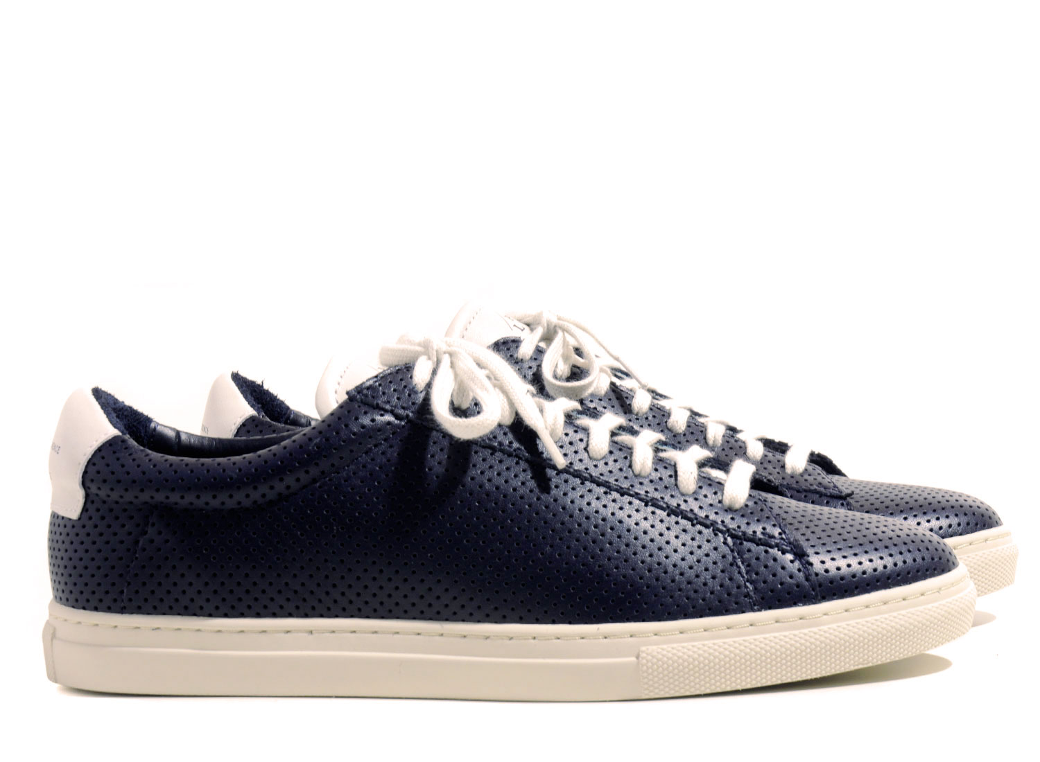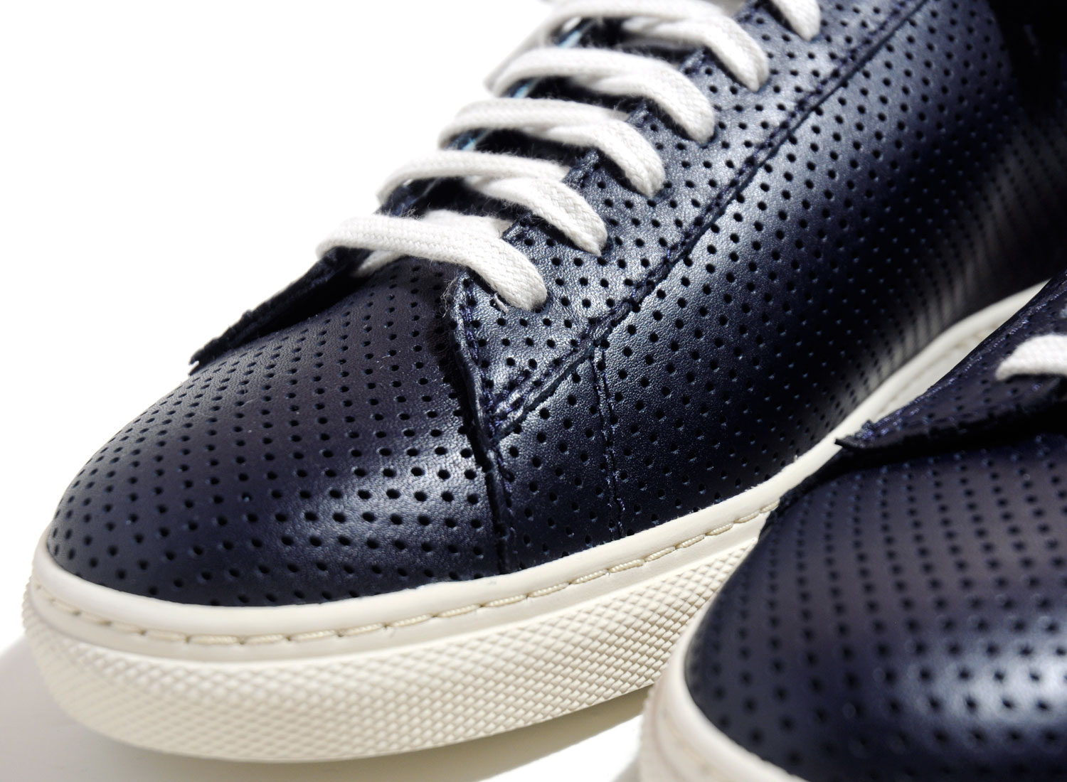 Coloris Navy monté sur une semelle vanille, cette paires en cuir de veau perforé arbore un branding exclusif et vous est livrée avec deux coloris de lacets.
