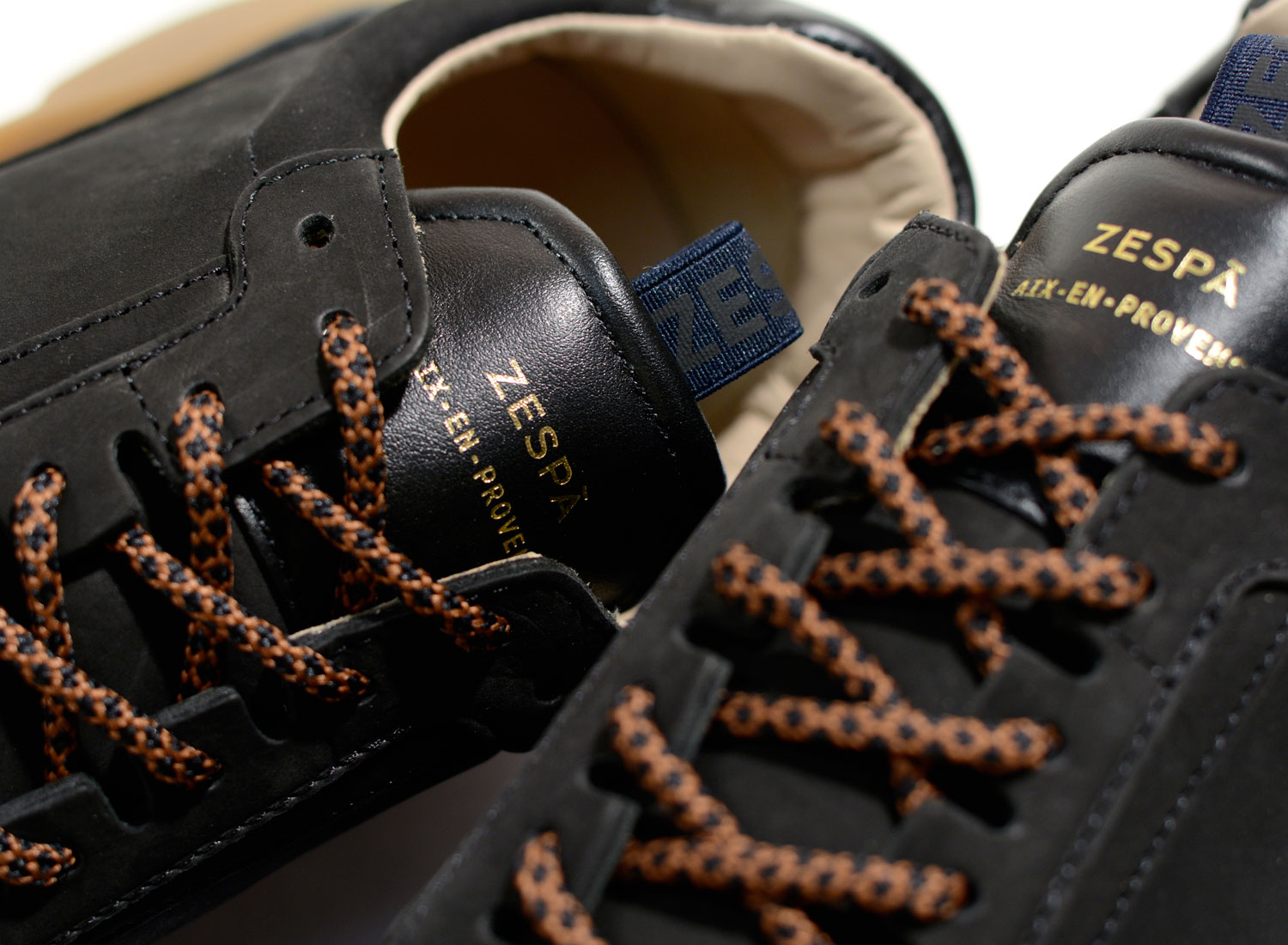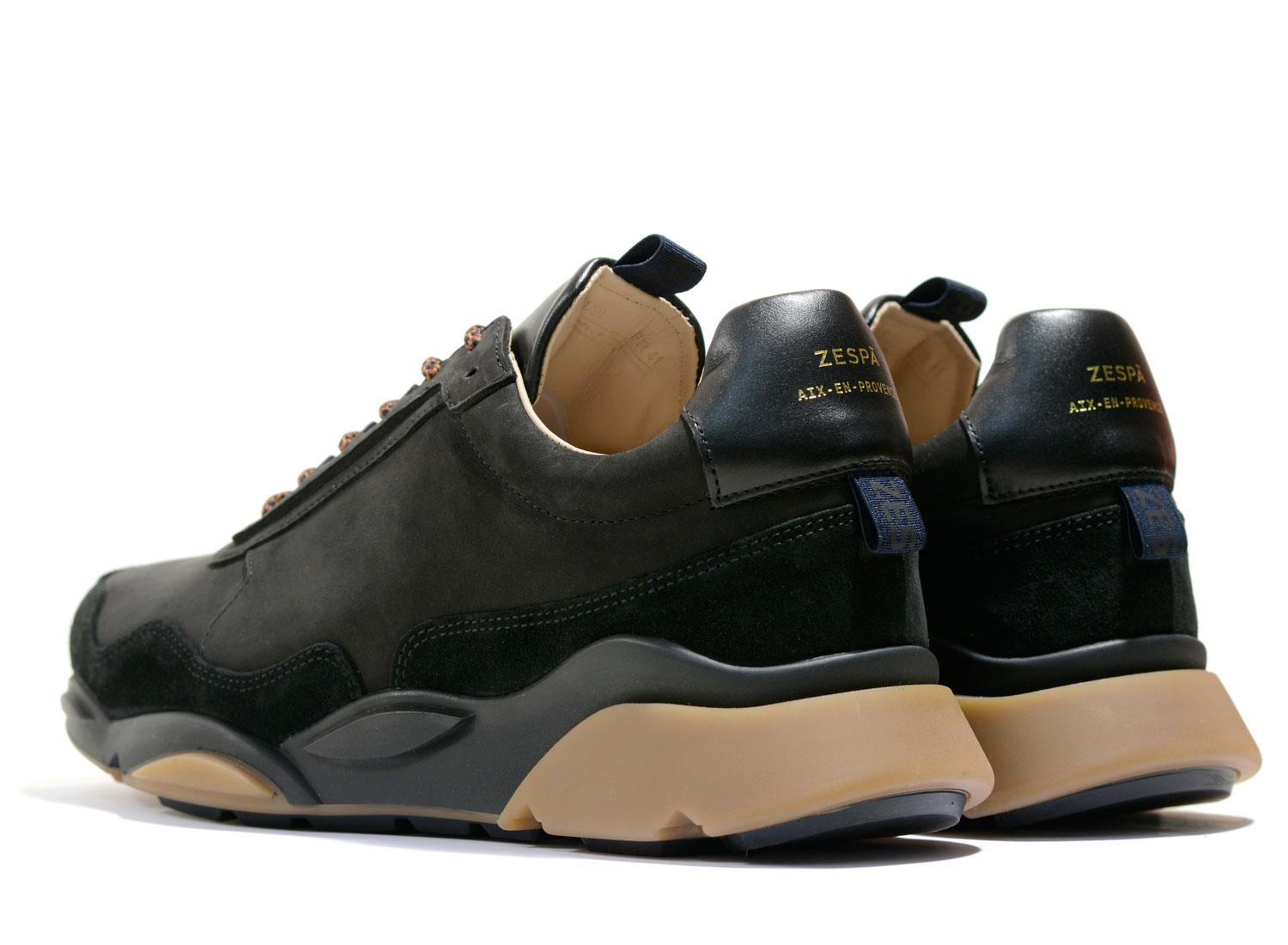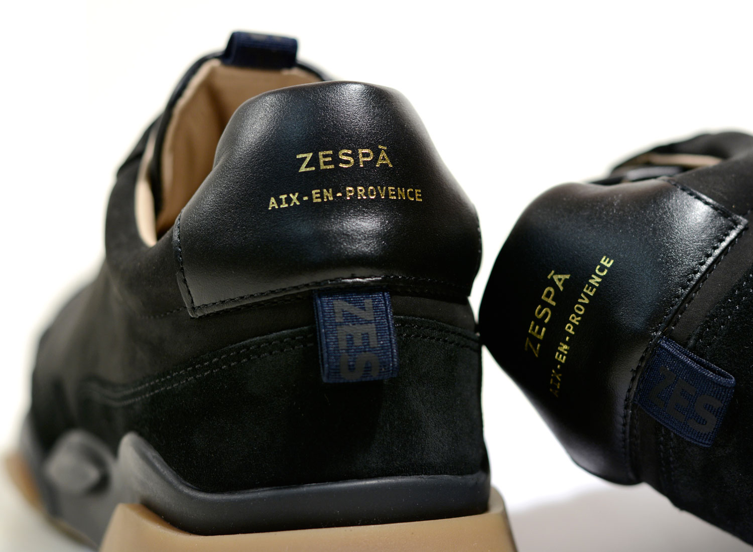 ZESPA ZSP7 Mix Matiere Black. Très belle running au design moderne. Mix de cuir nappa italien, veau velours et nubuck. Doublure veau pleine fleur Semelle intérieur anatomique recouverte de cuir veau pleine fleur. Logo façon dorure, embossé à chaud sur cuir. Semelle en gomme de qualité premium. Basket faite à la main avec semelle cousue latérale. Lacet en 100% coton peigné fabriqué en France.